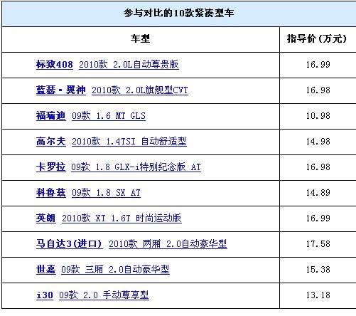 汽車之家的年度大戲又開鑼了!經(jīng)過兩個(gè)多月的精心策劃和準(zhǔn)備,我們組織了這次大型的緊湊型車全面對(duì)比!我們的目標(biāo)是將市場(chǎng)上主流的緊湊型車一網(wǎng)打盡,來一次從里到外、從靜到動(dòng)的全面PK。這次一共邀請(qǐng)到了以下十款車型,他們款型相對(duì)都比較新,消費(fèi)者在選車的時(shí)候經(jīng)常徘徊其中。從今天開始,我們將分別從外觀與做工、內(nèi)飾與空調(diào)、儲(chǔ)物空間、乘坐空間等四個(gè)靜態(tài)方面和動(dòng)力與操控性能、燃油經(jīng)濟(jì)性等兩個(gè)動(dòng)態(tài)方面以及保養(yǎng)售價(jià)等對(duì)這十款車進(jìn)行全面的對(duì)比。