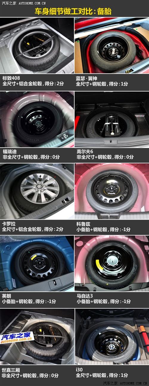 在這一環(huán)節(jié)的對比中,只有標(biāo)致408和卡羅拉使用了難得一見的鋁合金輪轂,其實(shí)408的低配車型使用的也是鋼輪轂。其他大部分車型都是鋼輪轂和非全尺寸備胎,其中值得商榷的就是福瑞迪,他全系都是195mm或者205mm的輪胎,但備胎卻都是185mm,原因當(dāng)然是為了節(jié)約成本。同時(shí),科魯茲、英朗和馬自達(dá)3兩廂使用的小備胎對于使用有一定的影響,我們必須扣分。