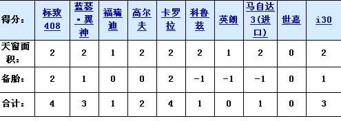 在天窗和備胎的對比中,得分最高的是408和卡羅拉,因?yàn)樗麄兌季哂泻艽蟮奶齑昂弯X合金輪轂的全尺寸備胎,而得分最低的英朗則主要是因?yàn)閭涮タ鄯,世嘉則是因?yàn)闆]有天窗,備胎也沒有任何特點(diǎn)。