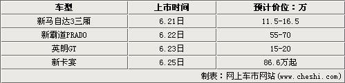 6月21日來自長安馬自達(dá)的馬自達(dá)3三廂車型將會亮相一個小改款車型,在外形上這款“新”馬自達(dá)3與老款車型區(qū)別并不大,沒有改變成為進(jìn)口馬自達(dá)3車型的全新外觀,但是整車配置方面有所提升。6.22日的時候國產(chǎn)豐田越野車PRADO俗稱霸道將會推出全新一代產(chǎn)品,新款PRADO外形和內(nèi)飾上都會相比老款車型有明顯的提升,而唯一令人期待的就是它的價格了。6月23日別克的三廂緊湊型轎車英朗GT將會正式上市發(fā)布價格,而據(jù)別克內(nèi)部人士透露英朗GT的定位可能并不會太低,因此期待英朗GT定出較低價位的朋友到時候可是要重點的關(guān)注一下了。最后一款是保時捷在中國持續(xù)大賣的豪華SUV卡宴,據(jù)說新的卡宴在北京車展亮相之后就已經(jīng)接到了非常多的訂單,僅北京就接近200臺的預(yù)定數(shù)量,那么如果您也希望購買保時捷新卡宴,真的要提早的去經(jīng)銷商那里提交一份訂單了。