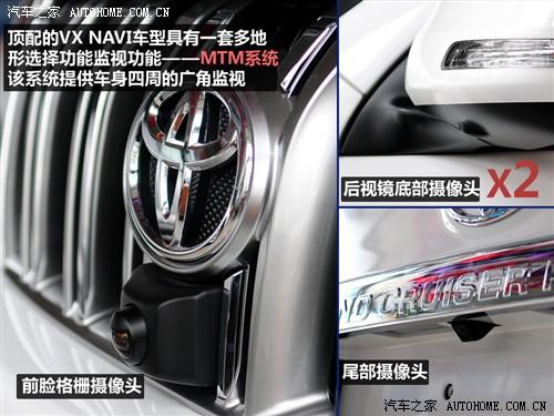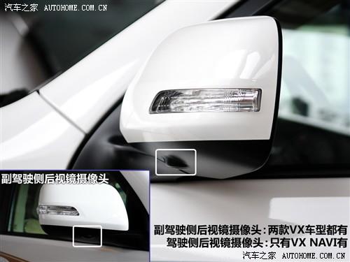 配置上的區(qū)別首先在前臉格柵就能發(fā)現(xiàn),因?yàn)樵谲嚇?biāo)下面隱藏了一個(gè)攝像頭,而這在低配車型上是沒有的,與之搭配的是正副駕駛后視鏡下面和車輛尾部也各有一個(gè)攝像頭,四個(gè)攝像頭組成了VX NAVI車型的“MTM多地形選擇功能監(jiān)視系統(tǒng)”。VX車型則沒有正駕駛后視鏡上的攝像頭。