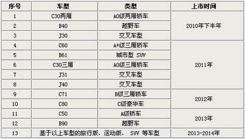根據(jù)規(guī)劃,在2010-2014年的五年內(nèi),將會陸續(xù)推出共計20款全新車型,不過目前已經(jīng)曝光的是12款新車,其中在2010年內(nèi)有3款新車下線,而2011年將推出5款新車,2012年將推出基于薩博平臺的C71、C80兩款豪華車,2013年比較引人注目的是酷似攬勝的B90將推出。