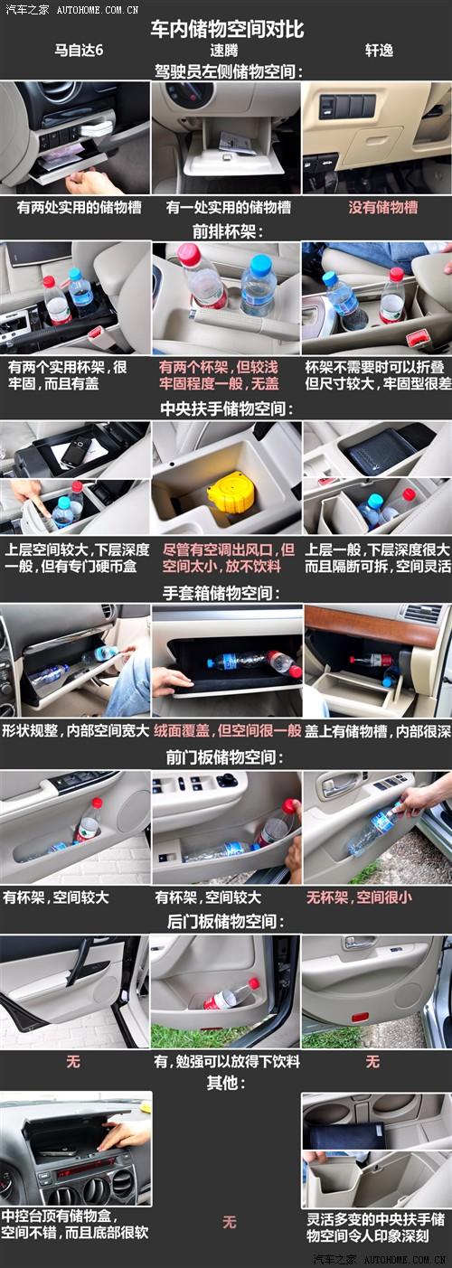 在這方面,速騰僅有的優(yōu)勢在于后門板上有儲物槽,而且能放得下飲料瓶,其他方面因為尺寸最小所以也沒什么亮點,特別是前排中央扶手內(nèi)的空間太小,幾乎沒什么使用價值;馬自達6的表現(xiàn)中規(guī)中矩,沒有花哨的設(shè)計,但也不乏亮點,比如中控臺頂部的儲物槽;軒逸的亮點是靈活而且寬大的前排儲物空間,以及非常深的副駕駛手套箱。