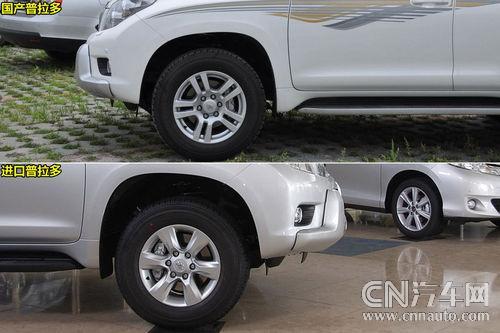 功能配置差異:此外,國(guó)產(chǎn)車型增添配置了電動(dòng)調(diào)節(jié)座椅,電動(dòng)調(diào)節(jié)方向柱,座椅加熱功能,智能感應(yīng)鑰匙一鍵啟動(dòng)系統(tǒng),電動(dòng)天窗等等。普通車型音響系統(tǒng)采用6碟CD和9個(gè)揚(yáng)聲器,而兩款NAVI車型則采用了更高的6碟DVD和14揚(yáng)聲器配置。不同于進(jìn)口車型的265/65R17輪胎,國(guó)產(chǎn)高配VX車型配置更加美觀的18寸五輻條雙叉臂鋁合金輪轂和265/60R18鄧祿普GTANDTREK系列AT22輪胎。