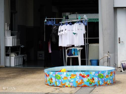 走進(jìn)賽車場后,我們發(fā)現(xiàn)每個(gè)pit房后面都有一個(gè)兒童游泳池↑