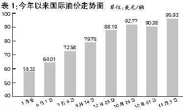 國內(nèi)油價上漲最直接的因素就是國際油價的大幅攀升。上周國際市場原油價格連創(chuàng)歷史新高,達(dá)到了94美元/桶。而在此前,紐約WTI原油期貨價格2007年年初價格為58.32美元/桶,3月份以后國際市場原油價格開始上漲,特別是近兩個月加速上升,9月14日和10月29日分別突破了每桶80美元和90美元。11月2日紐約原油期貨價格大幅上揚,比前一個交易日上漲2.44美元,終盤再創(chuàng)新高,收于每桶95.93美元。這個價格比起今年年初上漲了近40美元,漲幅超過80%。此間,國際油價雖然出現(xiàn)過小幅回落,但高位震蕩的格局一直難以改觀,甚至有愈演愈烈之勢。