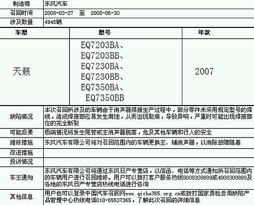 記者26日從質(zhì)檢總局獲悉,東風(fēng)汽車有限公司將從3月27日起,召回2007年4月9日至2007年6月13日期間生產(chǎn)的部分天籟轎車,共計(jì)4945輛。