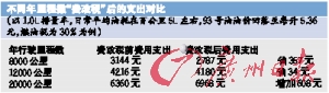 可以看出,按照現(xiàn)行油價計算,對于大部分車主來說,燃油稅率越高,所需支付的燃油部分的養(yǎng)車成本比重將更高;對于不同車型來說,排量越高,費改稅之后所需要支出的費用也越多;對于相同車型來說,每年行駛里程數(shù)越多,費改稅之后所需要支出的費用也越多。即使在燃油稅開征后,93號油油價回落至今年年初的每升5.36元,對于一輛一年行駛10005公里、油耗在5.0L每百公里左右的1.0L排量小車來說,在費改稅之后,還是需要多支付200多元油錢。