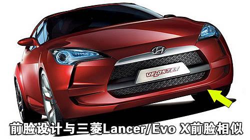 現(xiàn)代Veloster coupe概念采用的是現(xiàn)代Theta 2.0升直列四缸發(fā)動機,通過五前速自動變速箱將動力傳遞到前輪。雙車門設(shè)計,前臉設(shè)計讓我們想起了最新的三菱Lancer/Evo X前臉。