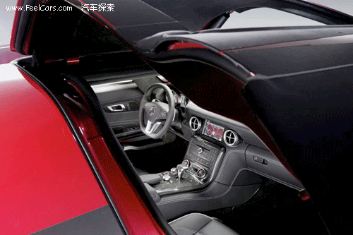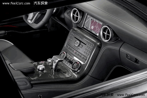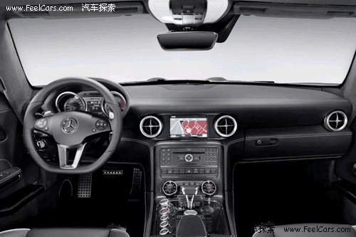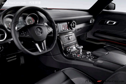 看到內(nèi)飾的第一感覺(jué)就是運(yùn)動(dòng)感很強(qiáng),無(wú)論是全黑色的真皮內(nèi)飾,還有鑲嵌點(diǎn)綴在各處的碳纖維面板,或者是三輻、平底的真皮方向盤(pán),像瞄準(zhǔn)鏡一般的空調(diào)出風(fēng)口等等,都毫不客氣的顯露出了SLS以運(yùn)動(dòng)為本的設(shè)計(jì)理念,當(dāng)然,這也是在向前輩300SL致敬。