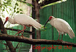 朱(擐右側加鳥)是中國最瀕危的野生動物,全世界僅存二百只左右,堪稱世界珍寶。北京動物園從八十年代中期試驗人工飼養(yǎng)繁殖,目前已發(fā)展到二十二只。其中十四歲的青青(左)和"丈夫"平平十年來年年產(chǎn)卵繁殖后代,對延襲朱(擐右側加鳥)家族貢獻巨大。