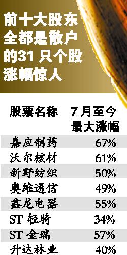 權(quán)威統(tǒng)計(jì)數(shù)據(jù)顯示,能夠在A股上市公司前十大流通股股東中“露臉”的個人投資者超過5000人。從中報(bào)來看,31只股票的前十大股東都是個人投資者,并且在7月份以來其整體表現(xiàn)十分出色,漲幅超過20%的就達(dá)22只。