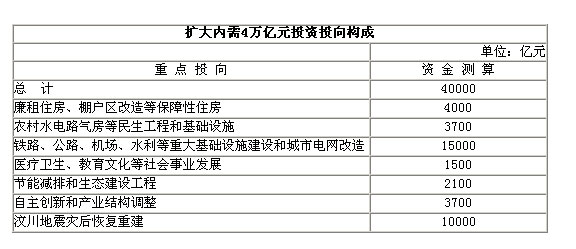 為了應(yīng)對(duì)金融危機(jī),2008年底,我國(guó)在出臺(tái)促進(jìn)經(jīng)濟(jì)平穩(wěn)增長(zhǎng)、改善民生、調(diào)整結(jié)構(gòu)的一攬子計(jì)劃,并確定了防止資金被擠占挪用的檢查督察機(jī)制,以及引導(dǎo)民間資本擴(kuò)大投資的方針政策。這項(xiàng)計(jì)劃涉及總投資4萬(wàn)億元,包括中央投資總額為11800億元。