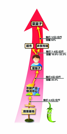 新華社“新華視點”記者日前調(diào)查發(fā)現(xiàn):目前蔬菜生產(chǎn)和流通環(huán)節(jié)出現(xiàn)一些怪現(xiàn)象,從批發(fā)市場到城內(nèi)的零售市場,蔬菜加價往往超過50%,其中少數(shù)菜品價格甚至翻倍。
