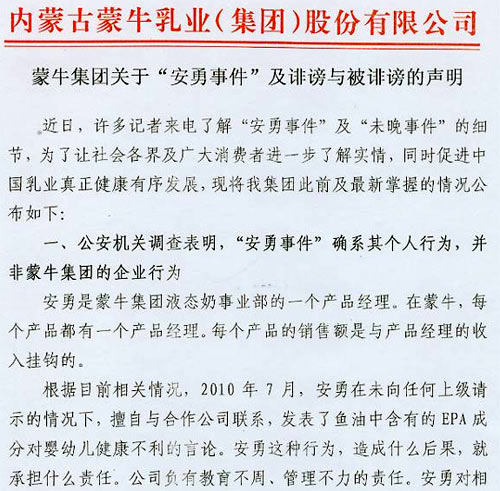 蒙牛集團(tuán)關(guān)于“安勇事件”及誹謗與被誹謗的聲明