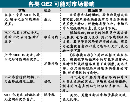 聯儲局內部明顯分裂,部分鷹派官員至近日仍不斷公開抨擊QE2,因此QE2最終規(guī)模大小仍存在變量。目前,市場普遍預期,聯儲局將宣布先在未來5個月購買5000億美元債券,并為之后再買更多資產留下空間。