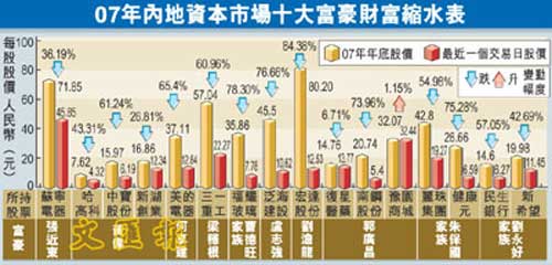 中新網(wǎng)7月28日電 據(jù)香港《文匯報》報道,中國內(nèi)地有媒體27日公布“2007資本市場富豪榜”,以07年A股市場最后一個交易日收市值計算,蘇寧電器大股東張近東等10大資本家榜上有名。受惠于2007年內(nèi)地股票市場爆發(fā)式增長,該榜單前十大富豪的財富最低門坎已升高至100億元,而2006年邁入前十俱樂部則只需要30億元。不過,僅僅半年,其中大部分人便“風(fēng)光不再”。隨著內(nèi)地股市半年來的一路慘跌,他們的身家亦大幅縮水。據(jù)統(tǒng)計,在榜單的前10名富豪中,所持有的股票下跌幅度最高竟達(dá)八成。