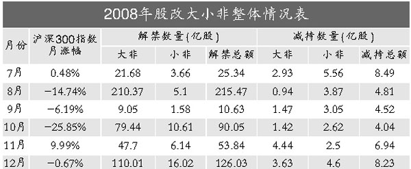 數(shù)據(jù)顯示,去年12月兩市共產(chǎn)生股改解禁股126.03億股,其中大非為110.01億股,小非為16.02億股,從滬深兩市來看,滬市解禁數(shù)量為79.94億股,深市解禁46.09億股。而當(dāng)月大小非減持?jǐn)?shù)量高達(dá)8.23億股,比去年11月份減持量增加15.6%,比去年7~12月平均每月減持量多出2.06億股,創(chuàng)出去年8月份以來的新高,僅比去年7月大小非減持最高峰少了0.26億股。