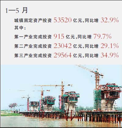 國家統(tǒng)計局今天發(fā)布的信息表明,今年前5月,城鎮(zhèn)固定資產(chǎn)投資53520億元,同比增長32.9%。其中,中央項目投資4734億元,同比增長28.0%;地方項目投資48786億元,增長33.4%。從產(chǎn)業(yè)看,第一、二、三產(chǎn)業(yè)分別完成投資915億元、23042億元和29564億元,同比分別增長79.7%、29.1%和34.9%。