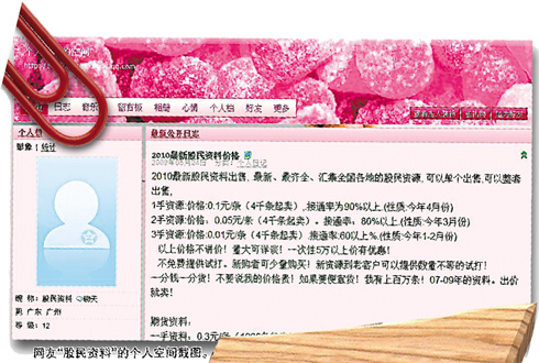 有人在網(wǎng)上發(fā)布叫賣廣告,有人在博客上叫賣,有的人在個(gè)人QQ空間里叫賣,更多的人則在一些網(wǎng)站上反復(fù)發(fā)帖叫賣。甚至有一個(gè)專門的“股民信息吧”,討論股民信息。這些網(wǎng)頁都宣稱,他們掌握的資料“最新”、“最準(zhǔn)確”、“來源權(quán)威”。