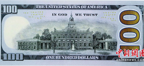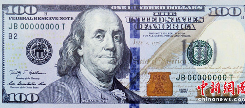 美國財(cái)政部公布了新版100元美鈔的照片,鈔票上同樣仍是美國開國元老之一的富蘭克林(Benjamin Franklin)肖像,但鈔票正中央多了一道藍(lán)色的3D立體安全圖樣,隨著角度不同,可以變換鐘或數(shù)字100的圖型。