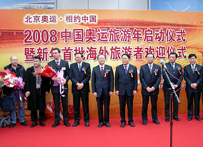 中新網(wǎng)1月2日電 據(jù)國(guó)家旅游局網(wǎng)站消息,2008年元月一日上午10:50分,CA932航班平穩(wěn)地降落在北京首都國(guó)際機(jī)場(chǎng)。飛機(jī)艙門打開時(shí),德國(guó)伊卡魯斯旅行社副總裁萊爾夫·琥珀先生接到了來(lái)自北京市旅游局工作人員送上的鮮花。他所率領(lǐng)的德國(guó)234名游客成為2008年北京入境的第一批旅游者。這標(biāo)志著2008年中國(guó)奧運(yùn)旅游年正式啟動(dòng)。
