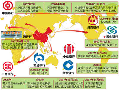 繼建行、中行和工行之后,交通銀行、民生銀行分別表示將在今年邁出海外并購的步伐。加上去年10月,我國金融企業(yè)進行的最大一筆海外收購——工行以55億美元的價格收購南非標準銀行20%股份,我國國有銀行進軍國際市場已開足馬力。