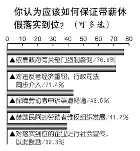 民調(diào)顯示,對(duì)于保證帶薪休假落實(shí)到位,76.6%的公眾認(rèn)為要依靠政府有關(guān)部門(mén)強(qiáng)制督促,大力推行;71.4%的人認(rèn)為要對(duì)違反者經(jīng)濟(jì)重罰,行政司法同步介入。接下來(lái),公眾給出的排序是:保障勞動(dòng)者申訴渠道暢通(43.5%);鼓勵(lì)民間的勞動(dòng)者維權(quán)組織發(fā)展(41.2%);對(duì)落實(shí)到位的企業(yè)進(jìn)行社會(huì)宣傳,以此鼓勵(lì)(39.3%)。(實(shí)習(xí)生 汪東亞)
