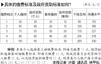 根據(jù)個人和經(jīng)濟組織繳費情況,政府資助分兩個層面,根據(jù)個人和經(jīng)濟組織選擇確定的繳費檔次,相對應(yīng)設(shè)立5個檔次的政府資助標(biāo)準(zhǔn)。對個人繳費的資助標(biāo)準(zhǔn)為35—65元不等;對經(jīng)濟組織繳費的資助標(biāo)準(zhǔn)為10—30元不等。政府對參保人的個人繳費的資助最長為15年。