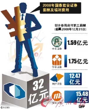 近日記者獲得了一份《2009年國泰君安證券總裁陳耿工作報(bào)告》,細(xì)讀中記者發(fā)現(xiàn),國泰君安證券2008年的薪酬及福利費(fèi)用高達(dá)32億元,遠(yuǎn)遠(yuǎn)超出公司年初預(yù)算數(shù)的20.41億元。即使面對大熊市,國泰君安在滬深兩市的交易量也排在全國所有券商的前三甲。目前國泰君安員工數(shù)大約在3200人左右,按報(bào)告中32億元的總薪酬及福利費(fèi)用計(jì)算,平均每個(gè)員工去年獲得的總收入就接近100萬元。