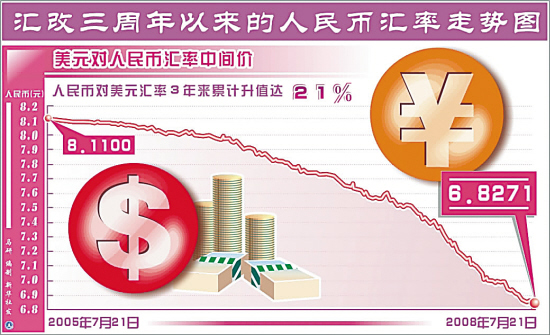 圖:匯改3年 人民幣對(duì)美元升值幅度已超過(guò)21% 圖片來(lái)源:錢(qián)江晚報(bào)