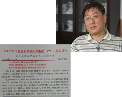 蔡進(jìn):“你看8月份的購進(jìn)價格指數(shù)是57.8%,比上個月大幅回落13.5個百分點(diǎn),這個是我們有記錄以來最大的一個降幅。就任何指數(shù)以前都沒有這么降過,它反應(yīng)什么?應(yīng)該說反應(yīng)我們國家這個宏觀調(diào)控的政策的措施出臺以后對價格的控制是取得了明顯的效果,價格的增長幅度的話,很可能會在今后幾個月會有明顯的回落!