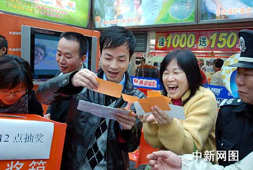 在廣東春節(jié)國(guó)內(nèi)游首場(chǎng)熱賣會(huì)上,抽獎(jiǎng)時(shí)中獎(jiǎng)的游客興高采烈。胡銀漢攝