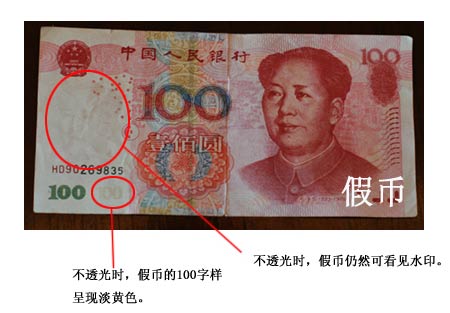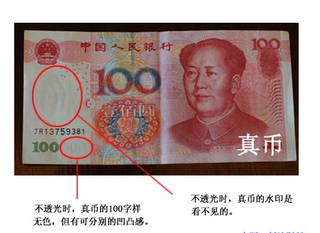 二摸。摸鈔票上中國(guó)人民銀行的漢字、毛主席頭像、凹印手感線、盲文標(biāo)記、背面的人民大會(huì)堂的圖案。真鈔的這些地方摸起來(lái)會(huì)有凹凸感,HD90假鈔摸起啦則非常光滑。