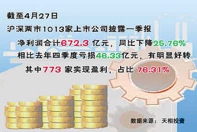 值得欣慰的是,這一加速下滑趨勢(shì)有望在今年一季度得到緩解。截至4月27日,兩市共1013家上市公司披露一季報(bào),其中773家公司今年一季度實(shí)現(xiàn)盈利,占比76.31%。已披露一季報(bào)公司今年一季度凈利潤(rùn)合計(jì)672.3億元,雖然同比仍然下降了25.76%,但和去年四季度的虧損46.33億元相比,已有明顯好轉(zhuǎn)。