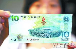 資料圖:面值十元的奧運紀念鈔。圖片來源:北京青年報