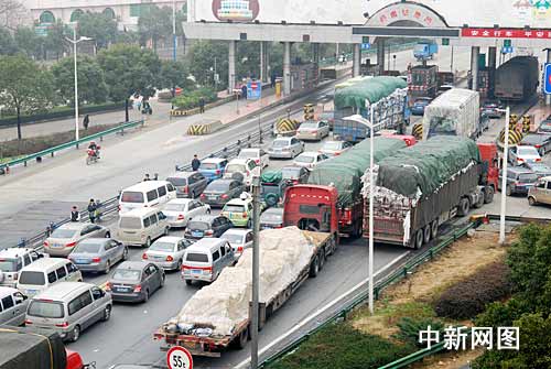 中新網(wǎng)九江2月7日電 (胡國(guó)林)連日來(lái),九江長(zhǎng)江大橋車輛驟增,自2月6日8時(shí)至7日8時(shí),九江長(zhǎng)江大橋車輛日通行量達(dá)到3.1萬(wàn)輛以上,已超過大橋的承載飽和數(shù)近60%,堵車嚴(yán)重,排隊(duì)車流自大橋收費(fèi)處蔓延數(shù)公里。