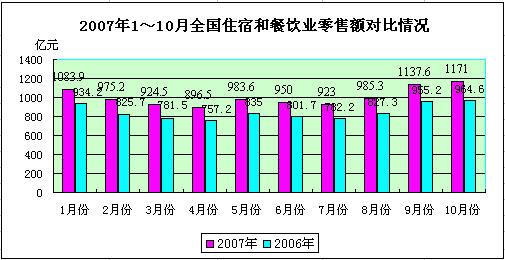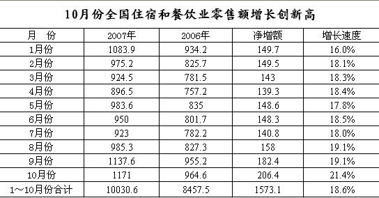 今年1-10月份,全國住宿與餐飲業(yè)零售額累計(jì)實(shí)現(xiàn)10030.6億元,同比增長18.6%,比去年同期增幅高出2.4個(gè)百分點(diǎn),占社會(huì)消費(fèi)品零售總額的13.9%,拉動(dòng)社會(huì)消費(fèi)品零售總額增長2.5個(gè)百分點(diǎn),對(duì)社會(huì)消費(fèi)品零售總額的增長貢獻(xiàn)率為15.7%。