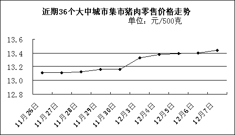 中新網(wǎng)12月10日電 國家發(fā)改委網(wǎng)站消息稱,據(jù)國家發(fā)展改革委價(jià)格監(jiān)測中心監(jiān)測,上周(12.3-12.7,下同)全國36個大中城市集市豬肉(精瘦肉)平均零售價(jià)格每500克為13.39元,比上期(11.26-11.30,下同)上漲1.98%。