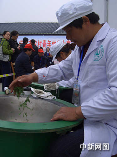 上午9點(diǎn),杭州市農(nóng)村青年炒茶大賽開(kāi)始。30多口炒茶鍋分成兩列排開(kāi),選手們挽起袖子,在鍋底抹上一點(diǎn)茶樹(shù)油,抓上剛剛采摘的春茶青葉丟下鍋。不停地拋、捫,兩分鐘時(shí)間,一股清新的茶香彌漫開(kāi)來(lái)。