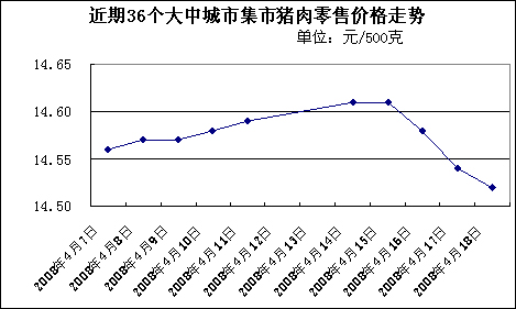 中新網(wǎng)4月21日電 中國國家發(fā)改委網(wǎng)站消息,據(jù)發(fā)改委價格監(jiān)測中心監(jiān)測顯示,上周(2008.4.14-2008.4.18,下同)中國36個大中城市集市豬肉(精瘦肉)平均零售價格每500克為14.57元,與前一周(2008.4.7-2008.4.11,下同)持平。