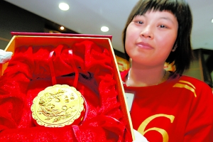 昨天上午,家住沈陽市大東區(qū)的李女士去買月餅,路過一商場的金店時,被眼前的一個“月餅”嚇了一跳!鞍?黃金的。”和李女士一樣,很多顧客對這塊“黃金月餅”感到驚奇。