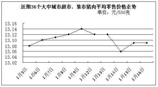 中新網(wǎng)1月19日電 據(jù)國(guó)家發(fā)展改革委價(jià)格監(jiān)測(cè)中心監(jiān)測(cè),上周(1月12日-1月16日)36個(gè)大中城市超市、集市豬肉(精瘦肉)平均零售價(jià)格每500克為13.10元,比前一周(1月5日-1月9日,下同)下降0.08%。