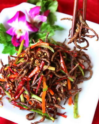 說(shuō)起蚯蚓這種扭曲的小蟲,你的第一反應(yīng)也許是肥美的魚餌。不過(guò),金堂趙鎮(zhèn)的一家農(nóng)家樂,卻把蚯蚓擺上餐桌,經(jīng)過(guò)油炸、爆炒,成為其招牌菜——“干煸地龍”,售價(jià)98元一份。這道有些古怪的菜品,吸引了不少獵奇的食客。昨日,記者走進(jìn)這家農(nóng)家樂的廚房,一探究竟。
