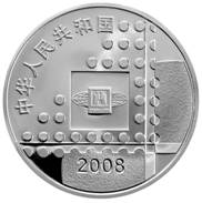 該枚銀質(zhì)紀念幣正面圖案為象征錢幣的點和裝飾線與北京國際郵票錢幣博覽會會標組合設計圖,并刊國名、年號。
