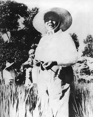毛澤東到成都就說了要到一個(gè)合作社看看。時(shí)任中共四川省委第一書記的李井泉深諳主席習(xí)性,提前吩咐新都和郫縣各安排一個(gè)社作好準(zhǔn)備:出金牛賓館的大門往左是新都的那個(gè)社,往右即郫縣的紅光社。兩個(gè)縣的縣委第一書記放下一切事情,每天騎著自行車專門等候在金牛賓館大門口。三月十六號(hào)下午四點(diǎn)左右,毛澤東午睡起床以后,決定到鄉(xiāng)下走走,在李井泉的陪同下,汽車駛出招待所大門,李井泉問毛澤東往哪邊走,偉人之手朝右邊一揮,就描繪出了紅光社的一頁(yè)濃墨重彩和光輝歷史,同樣等候于此的新都的女縣委書記,因此傷心地大哭了一場(chǎng)。