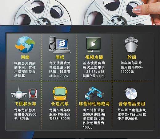 除網(wǎng)吧、長途車外,影著協(xié)還將逐步推進網(wǎng)絡(luò)、視頻點播、飛機、火車、非營利性局域網(wǎng)、音像制品出租等領(lǐng)域電影使用費的收取。