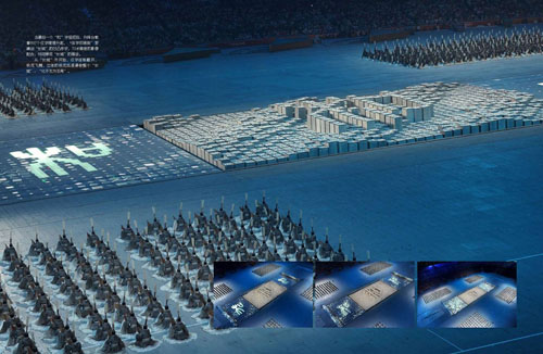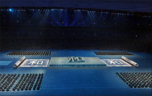 2008年北京奧運會開幕式上,幾百名演員扮演的活字印刷字模通過不斷變幻,用大篆、小篆、楷書三種不同字體展現(xiàn)了同一個漢字——“和”。