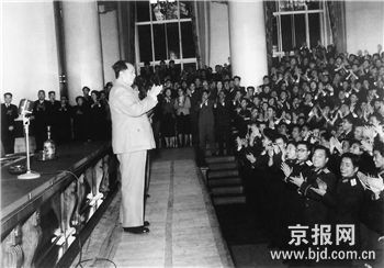接著,毛主席給大家談了當(dāng)時(shí)的國際形勢,他首先指出,十月社會(huì)主義革命是人類歷史上一個(gè)轉(zhuǎn)折點(diǎn),國際共產(chǎn)主義運(yùn)動(dòng)的團(tuán)結(jié)和蘇聯(lián)兩顆人造地球衛(wèi)星上了天,這兩件事標(biāo)志了兩大陣營力量對(duì)比的新的轉(zhuǎn)折點(diǎn)……十月革命產(chǎn)生了新世界,經(jīng)過40年,新世界的力量已經(jīng)超過了舊世界……現(xiàn)在不是西風(fēng)壓倒東風(fēng),而是東風(fēng)壓倒西風(fēng)。毛主席說到這里,大廳里又響起了熱烈的掌聲。