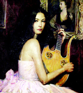 當(dāng)華人社區(qū)對這位“英雄”贊不絕口時(shí),徐純中也成了最受好萊塢明星歡迎的畫家。畫冊中一幅《甜蜜的琴聲》正是當(dāng)紅女星凱瑟琳.澤塔.瓊斯的肖像畫。據(jù)徐純中回憶,澤塔.瓊斯當(dāng)時(shí)特地從好萊塢借了一把十分名貴的古琴,還選了一件粉色衣服,來突出自己象牙白的膚色。不過,性格活潑的澤塔.瓊斯每次坐不到十分鐘,就要起身吃東西、接電話,或者吩咐仆人做什么事。徐純中笑說,“過了3個(gè)半小時(shí),我還沒有畫完,澤塔.瓊斯有些不耐煩了。于是,我只能帶著未完成的初稿回去上色。作品完成后,她對我的作品非常滿意,并與我相約每隔兩年,為她畫一次肖像,現(xiàn)在我已經(jīng)著手第三幅了!